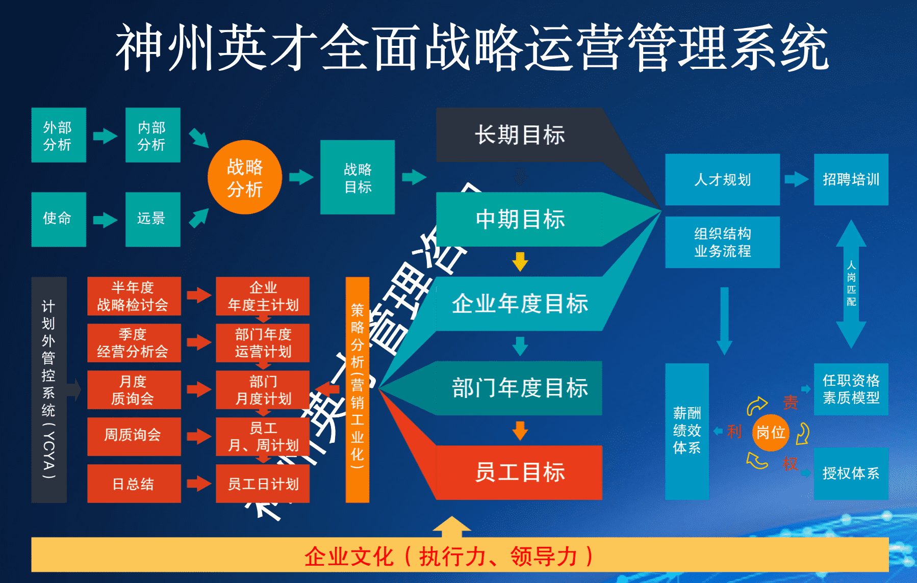 從《全面戰(zhàn)略運(yùn)營(yíng)管理系統(tǒng)》來(lái)看,企業(yè)管理系統(tǒng)的七個(gè)大方向,即支撐企業(yè)發(fā)展的企業(yè)執(zhí)行力和個(gè)人領(lǐng)導(dǎo)力,以及管理者需要具備的五項(xiàng)大系統(tǒng):決定企業(yè)發(fā)展的戰(zhàn)略系統(tǒng)、培養(yǎng)人才的人力資源系統(tǒng)、提升凝聚力的企業(yè)文化系統(tǒng)、復(fù)制銷售能人營(yíng)銷工業(yè)化系統(tǒng)、提升組織效率的運(yùn)營(yíng)管控系統(tǒng)。