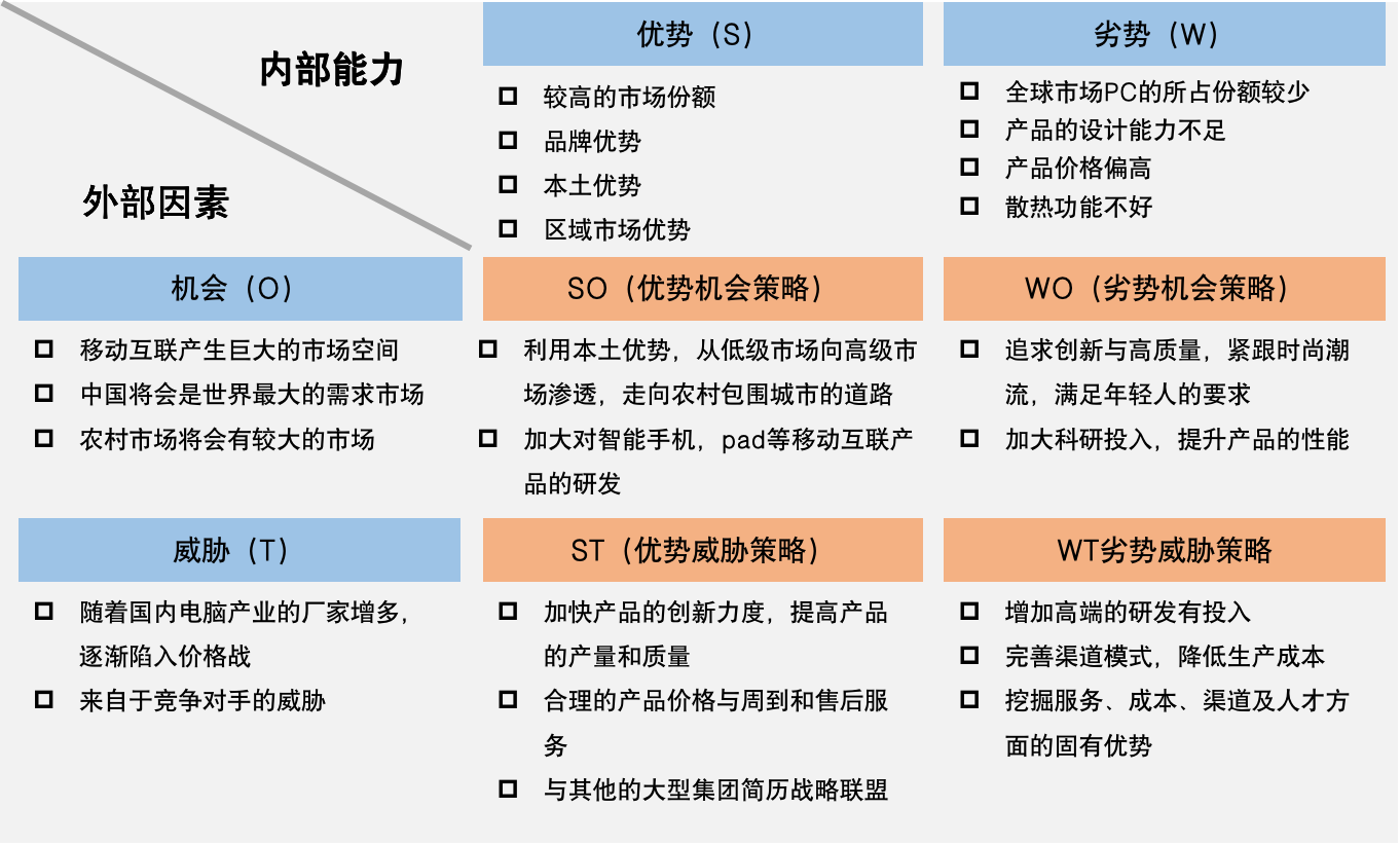 背景:聯(lián)系集團(tuán),創(chuàng)立于1984年。現(xiàn)有聯(lián)想及IBM個(gè)人電腦事業(yè)部組成。主營(yíng)業(yè)務(wù)包括臺(tái)式電腦、筆記本電腦、服務(wù)器、打印機(jī)、掌上電腦、手機(jī)等,在對(duì)聯(lián)想分析時(shí)得出了以下情況和結(jié)論: